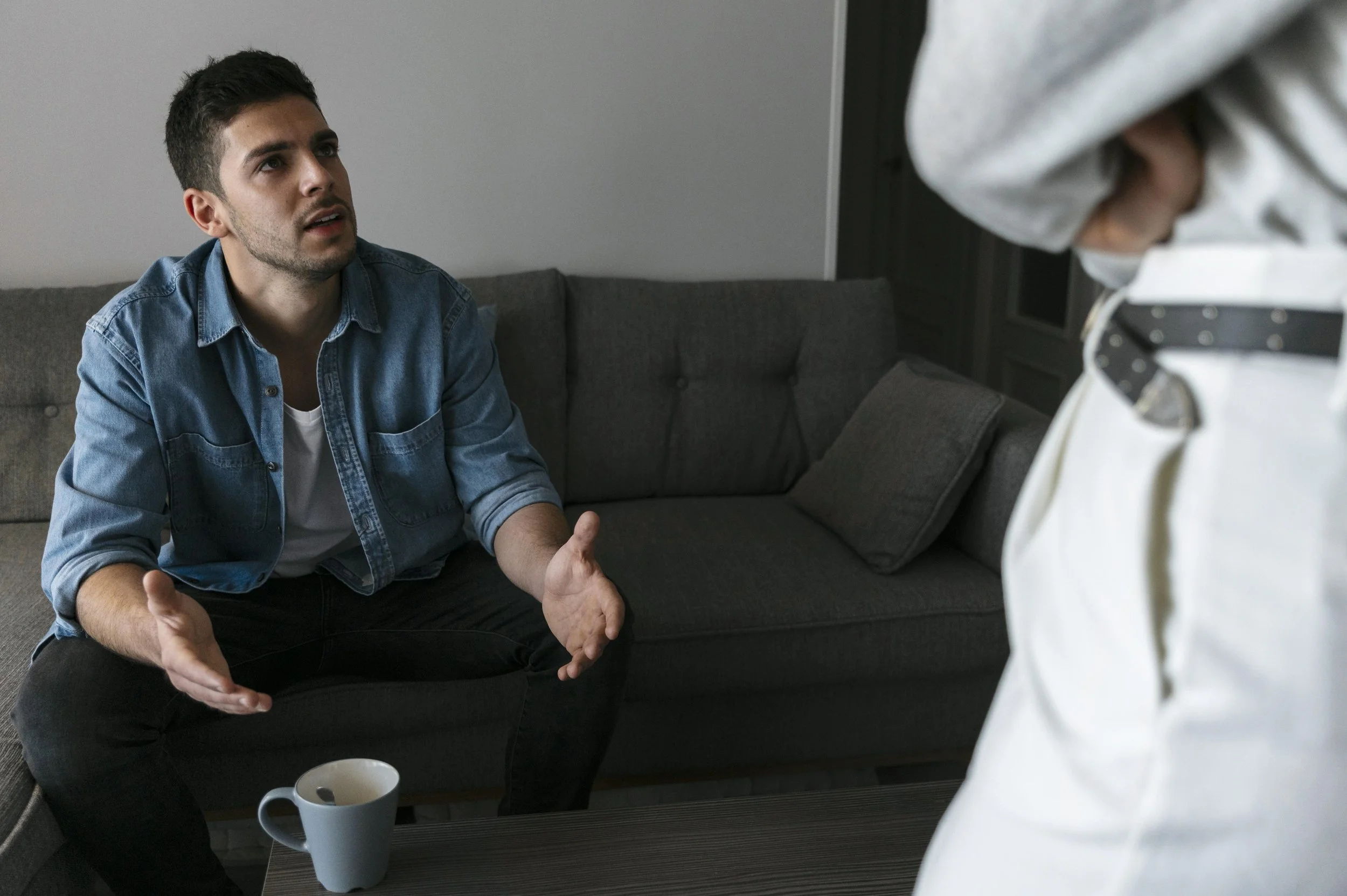 A man sitting on a couch engages in conversation with his partner about narcissistic abuse - Relational Trauma Therapist